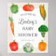 Um chá de fraldas de boas-vindas ao mercado de agricultores. Design apresenta legumes pintados manualmente com aquarela em um fundo leve de gingham.