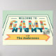 Poster da Noite de Jogo com uma tipografia divertida de "Noite de Jogo''. Esses designs incluem elementos de azul, amarelo, vermelho e laranja, um fundo de conselho de jogos, dados, peças de jogos, cartões de jogos e elementos inspirados nos jogos de conselho. Os produtos incluem um modelo para personalização pessoal.