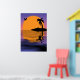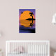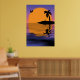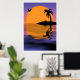 Poster de um pôr do sol tropical com um pássaro, uma palmeira e uma flor numa ilha na água. Uma continuação perfeita para a série Flamingo Sunset