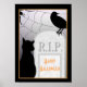 Um design gráfico de design de tombstone RIP com o texto 'Happy Halloween' em um poster.