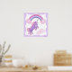 Um poster de fantasia com unicórnio roxo, arco-íris pastel e nuvens cor-de-rosa com borda roxa e poeira estelar. Uma bonito adição ao quarto de qualquer princesa.