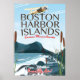 Boston Harbor Massachusetts, EUA, vintage style cartoon poster de viagens com um avião leve clássico voando sobre as ilhas.