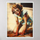 This whimsical 1940's zombie pin-up model strikes a captivating pose, her glowing eyes creating an irresistible undead charm. With torn clothing and hints of decay, she still exudes playful confidence—blending retro glamour with a delightfully ghoulish twist.