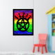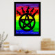 um pentáculo negro com o Grego Deus Pan tocando seus panfletos liderando dançarinos com as palavras "deixe a música do Pan guiar você"
