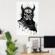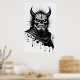 Um retrato de um demônio com cabelo preto e dois chifres negros e amarelos olham o olhar profundo em sua alma e evoca um senso de poder, perigo e destruição. Esta é uma arte gerada por IA.