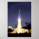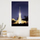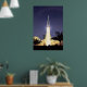 Ilustração 2D de foguete decolando com palmeiras silenciadas no primeiro plano.
