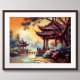 Poster Desenho de Pastel da antiga vila Pagoda chinesa