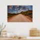 Esta incrível foto do Getty Images apresenta uma estrada de terra e o Parque Nacional do Saguaro, levando a um belo pôr do sol nublado com saguaro cactus perto da estrada.