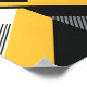 Um design abstrato dinâmico com formas geométricas nítidas, linhas diagonais e uma paleta colorida em negrito de amarelo, preto, cinzas e branco. A combinação de fitas grossas e finas agrega profundidade e movimento, perfeito para aplicações modernas e criativas.