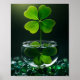 Uma Rua alegre. O dia de Patrick com um trevo sortudo de quatro folhas cercado por canecas de cerveja. O trevo é verde vibrante com detalhamento intrincado, sorte radiante e festividade. As canecas de cerveja são ouros com espuma branca transbordando, acrescentando um toque comemorativo. Moedas Douradas e um sutil sotaque arco-íris no fundo de uma Rua mágica.