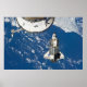 O Space shuttle Discovery é apresentado nesta imagem fotografada por um membro da tripulação da Expedição 23 na Estação Espacial Internacional logo após o ônibus e estação iniciarem sua separação relativa de desacoplamento postado. O desacoplamento das duas naves espaciais ocorreu às 7:52 da manhã. (CDT) no dia 17 de abril de 2010, terminando uma estadia de 10 dias, 5 horas e 8 minutos. A visita incluiu três espaçonaves e a entrega de mais de sete toneladas de equipamento e material. Uma parte azul e branca da Terra fornece o pano de fundo para a cena. Uma pequena porção de uma espaçonave russa, acoplada à estação, é visível no topo.