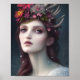 Belo poster apresenta uma impressionante imagem gerada por IA da Deusa do inverno, Marzanna (Eslavo) ou Khione (Deusa Grega da Neve) em um estilo de retrato de arte fino com cores ricas e uma coroa floral e anã exuberante.