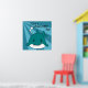 Tubarão-cartoon azul e branco, engraçado, com pequenos olhos ovais pretos e uma fileira de dentes brancos pontiagudos. O fundo é listras azuis claras e escuras radiando do canto superior esquerdo. Acima do tubarão, encontram-se as palavras Um Dia de Jawsome em texto negro.