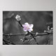 Esta poster apresenta uma flor de cereja rosa contra um fundo natural em preto e branco.