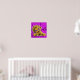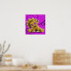 Um bebê triceratops bonitinho com a cabeça inclinada a sorrir para ti. Mostrado com um design floral sobre fundo roxo. O tamanho do poster é 16" x 16".