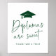 Sinal de festa de formatura moderna com ilustração de um boné de formatura verde no topo com "Diplomas são doces" em um roteiro manuscrito verde. Personalize o poster de graduação com o seu texto personalizado (mostrado atualmente com "por favor, faça uma apresentação"). O sinal de festa de formatura é perfeito para exibir em uma mesa com favores de sobremesa ou festa de formatura doce para seus convidados.