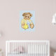 Adorável decoração de berçário com um ursinho de pelúcia fofo vestindo um Tam. Um lindo pintinho amarelo dançante e amigos coelhinhos de brinquedo azuis estão por perto. Fundo xadrez azul pastel. Seria uma doce adição a um berçário.