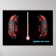 Representação fractal de um núcleo atômico dividido por uma partícula de alta energia. Leitura de texto, "Divisão do Atom" aparece em azul e branco brilhantes.