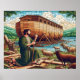 A imagem mostra Noé fazendo os feixes da arca, enquadrados por uma paisagem de tranquilidade. Os animais reúnem-se em torno da arca crescente, que é um sinal monumental de fé e intervenção divina.