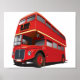 Este design é um ônibus vermelho de dois andares. O ônibus é da frente em um ângulo leve e não tem passageiros. Este design de barramento de dois andares vermelho parece excelente neste Poster