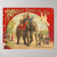 Poster vintage de reprodução vermelha de crianças que montam um elefante de circo guiado por um mestre de cirurgia. Acima estão as palavras "Animal Tame and Wild" em fontes amarelas. Partridge & Co. [c. 1875]