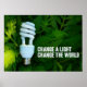 Poster do Dia da Terra com uma lâmpada fluorescente compacta e a frase "Mudar uma luz, mudar o mundo". Compartilhe sua mensagem para proteger a Terra com nossos posters e presentes no Dia da Terra.