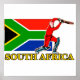 Um jogador de críquete sul-africano ao lado de uma bandeira sul-africana com o nome do país África do Sul no canto inferior