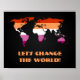 Poster de valor com o mapa do mundo na cor da bandeira do orgulho lésbico, design num fundo preto; o texto 'Vamos Mudar o Mundo' é um texto modelo e pode ser alterado,