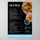 Crie um menu profissional e atraente para o seu café, bistro ou pequena comedoria com este poster de menu de restaurante totalmente personalizável. Com um fundo preto elegante, sotaques azuis na moda e espaço para até 10 pratos, este modelo é perfeito para mostrar suas ofertas de comidas de uma forma polida e moderna. Todo o texto, preços e imagens podem ser editados para corresponder à sua cozinha - esteja você servindo macarrão, sushi, hambúrgueres ou pratos baseados em plantas. Ideal para especiais diários, promoções de horas felizes ou menus permanentes de parede. Personalize-o facilmente para se adequar às suas cores de marca ou atualizações sazonais.
