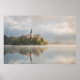 Poster de um nascer do sol nebuloso no lago Bled com a ilha com igreja e névoa com reflexo na água à luz do sol da manhã na Eslovênia. decoração de excelente na sua parede!