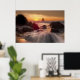 Apresentando um fôlego considerando um pôr de sol laranja sobre o topo do oceano e as ondas atingindo a costa do oceano. esta é uma bela foto nesta poster