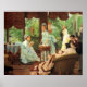 Poster do Partido do Chá Vitoriano James Tissot. Pintura a óleo na canvas de 1878. O artista francês James Tissot's Victorian Tea Party (No Conservatório) apresenta um grupo de aristocratas Victorianos tomando chá em uma estufa conservatória. Uma mulher senta-se numa cadeira com um vestido vermelho e rosa, enquanto duas irmãs sopem de teacups vestindo vestidos vitorianos azuis com fitas azuis e fritos. Um jovem se senta perto como casal nos bate-papos ao fundo. Palmeira pode ser vista através do vidro conservatório. Um belo presente para fãs de James Tissot, Inglaterra vitoriana, festas de chá de vintage e moda vitoriana.