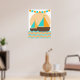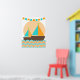 Um excelente náutico de design de berçário de veleiro para quarto de bebê ou quarto de criança mais velha apresenta um veleiro com velas azul e laranja, um oceano de stripe de guará de lacre e laranja, e faixa de bandeiras e laranja.