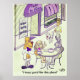 A poster with a funny cartoon about dogs meeting at a dog cafe. Original artwork by DBcartoons.