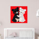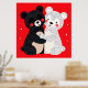 Dois ursos em estilo de desenho animado, um preto e um branco, abraçando-se. O urso preto tem orelhas arredondadas e é adornado com padrões pontilhados, com bochechas rosadas que acrescentam à sua expressão cativante. Ele tem uma mancha bege na barriga. O urso branco, também coberto de padrões pontilhados, tem um sorriso alegre e bochechas rosadas também. O fundo é um vermelho vibrante, que contrasta vivamente com os ursos. No geral, a ilustração transmite uma sensação de calor e amizade.