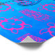 Golfinho saltando através de um símbolo solar Maori com um oceano azul e um veleiro atrás dele. Tartarugas Honu cor-de-rosa e máscaras tiki cor-de-rosa sobre um fundo azul oceânico.