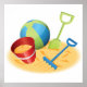 Brinquedos de praia para diversão na praia. O essencial está nesta design de praia. Tem uma pá, um rake, um balde, uma bola de praia e um pouco de areia. Este design de brinquedos de praia parece excelente neste poster. Perfeito para si mesmo ou como presente