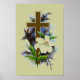 pintura em vintage com uma cruz cristã dourada com borda branca e lindas flores brancas e botões com folhas verdes à sua frente, e um lindo spray de flores roxas atrás da cruz.pintura a aquarela em ouro e verde. pintura a aquarela em dourados e verdes.