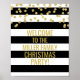 Texto personalizado bem-vindo à placa da festa de Natal com padrão moderno de listras brancas e pretas e um confete de ouro festivo.