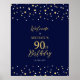 Bem-vindos aos seus convidados a um dia especial de celebração com este na moda de ouro e marinho de sinal azul de boas-vindas. Este cartaz apresenta a tipografia moderna" Bem-vindo ao 90 Birthday" e um design de confetti hexagon. Você pode personalizar o nome e a data. Convites e suprimentos de festa estão disponíveis no meu compro BaraBomDesign.