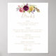Este cartaz de menu de bebidas florais tropicais de ouro é perfeito para um casamento moderno. O design apresenta penas castanhas pintadas à mão, cor amarela-boho, branca, púrpura, rosa, pincel, flores borboletas e bagas azuis perfeitamente organizadas em belos buquês.