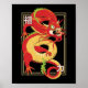 Os dragões vermelhos chineses são símbolo mítico de uma sorte e poder (os dois símbolos nesta design). São também um dos sinais do zodíaco chinês. Ilustração gráfica de design na poster para fãs de dragões e amantes da mitologia da China.