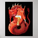 Poster do Dragão Bebendo de Cerveja. Design gráfico de uma cerveja de bebendo de dragão vermelho enquanto faz o sinal de metal pesado dos chifres com a mão. Engraçado ilustração para amantes de cerveja.