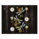 Marcadores e teclas antigas com engrenagens de ouro e latão, decoradas com libélulas mecânicas e boias em fundo castanho e listrado.