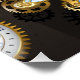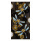 Marcadores e teclas antigas com engrenagens de ouro e latão, decoradas com libélulas mecânicas e boias em fundo castanho e listrado.