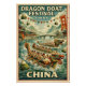 Travel poster celebrating the Dragon Boat Festival (Duanwu Festival) in China, illustrated in a bold retro travel-poster style. Dynamic scene of traditional dragon boats racing on a river, long colorful dragon heads, paddlers in synchronized motion. Riverside with ancient Chinese architecture, bridges, and misty mountains in the background. Add floating zongzi (sticky rice dumplings) and festive banners for cultural detail. Rich color palette: jade green, deep red, gold, muted blue, cream. Subtle vintage grain texture. Bold classic typography: “DRAGON BOAT FESTIVAL – CHINA”. Vertical 2:3 layout, high-resolution, print-ready.