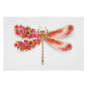 Articulado artificialmente, ouro, libélula joalhada com vermelho e asas decoradas com cereja japonesa vermelha, florescente e joalhada sobre fundo branco. Dourada Dragonfly.