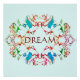 Um design de mandala suave e brilhante é apresentado em vermelho, azul, verde e burgundy acado sobre fundo aqua claro, com a mensagem inspiradora para "Sonho", quer isto signifique objetivos e visões futuros — ou relaxando num sono tranquilo.