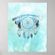 Linda ilustração aquática de uma caçadora de sonhos com embelezamentos de penas sobre fundo azul-aquarela.