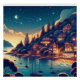 Bring the magic of a Mediterranean evening into your home with this stunning coastal village poster. The artwork features a glowing hillside town overlooking a calm harbor, set beneath a breathtaking sky of shooting stars and a crescent moon. With its rich teal blues and warm amber highlights, this high-quality print is perfect for creating a cozy, whimsical atmosphere in a bedroom, living room, or home office. A beautiful gift for dreamers and ocean lovers alike.